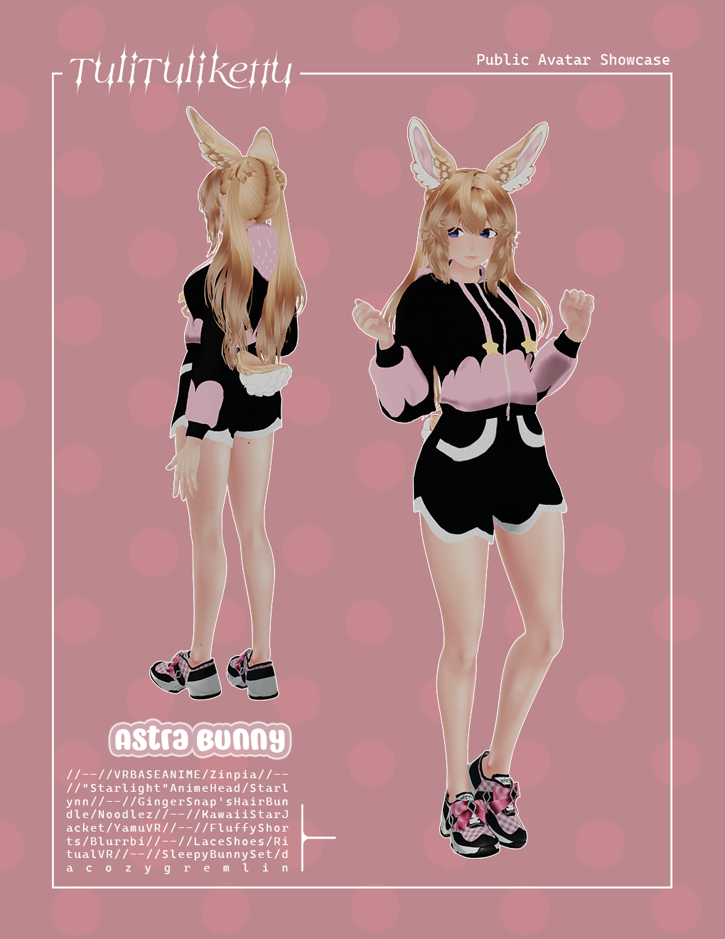 It’s goth, and it’s comfy! This uses clothes that came with the Nebula base, so the real struggle was optimizing it; the endless laces really gave me a hard time… so many tris! The cardigan can come off for a bit more of a svelte look, and the ribcage details on the dress are also Audiolinked. I don’t usually change Tuli’s base features (like the gold details on the braids and ponytail) but it felt appropriate here… it matches the detail on the dress and the spikes on the collar.