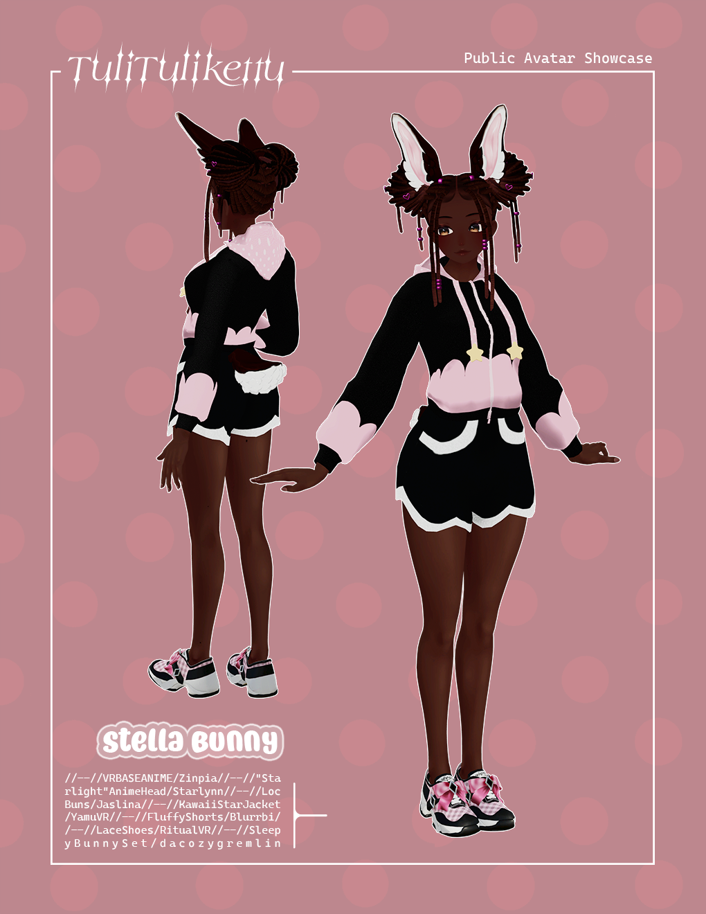 I think this was the first edit of the Nebula base that I made? No new assets except the backpack (and, I mean, the head/hair/braids). I really like the vibe, but I kind of over-decimated the hair so I eventually have to go through and redo the optimization. I really love the backpack, it has a bunch of clever Audiolink integrations, including a whole visualizer. The Nebula base itself is also really cute, but I do fight with it a bit when it comes to the chest tracking.