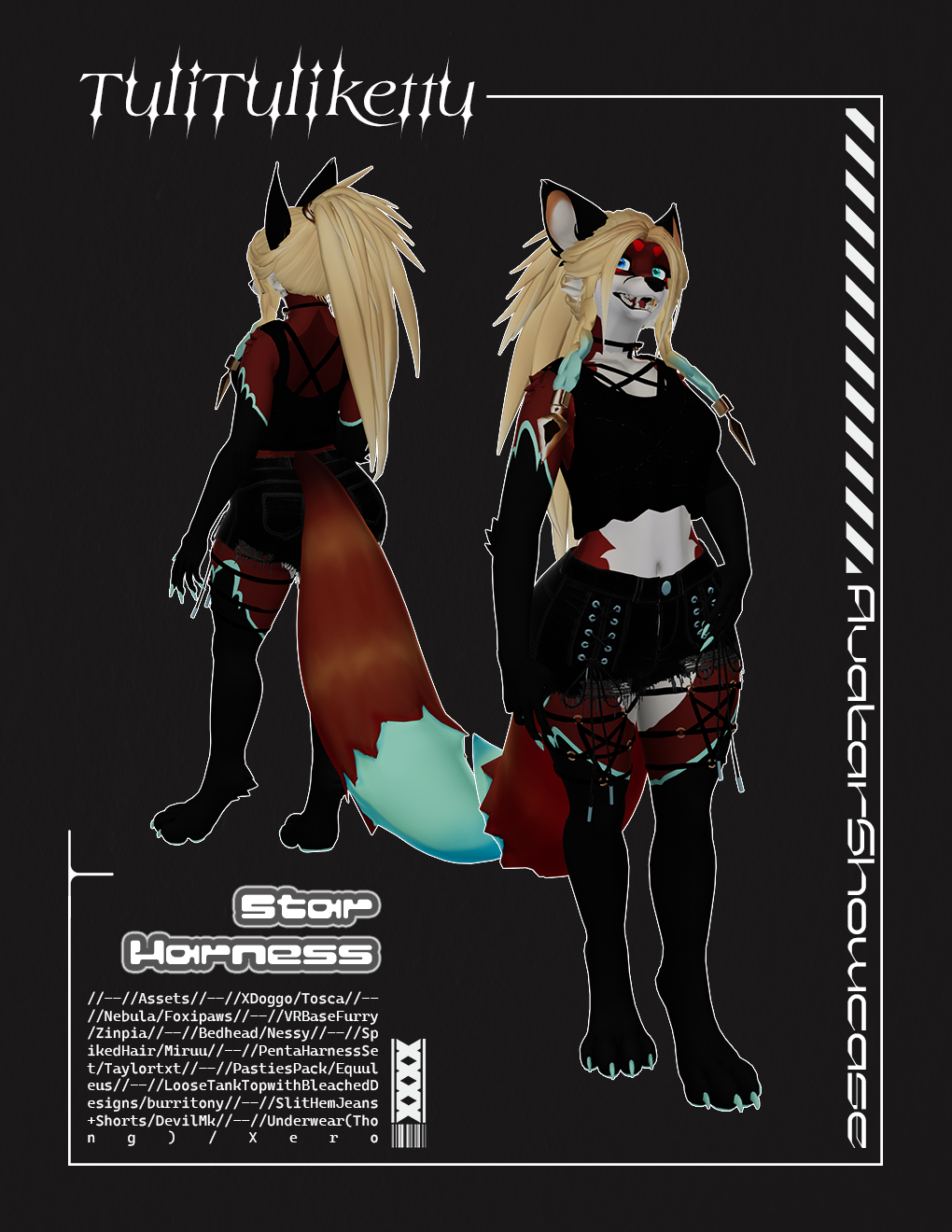 My current go-to. Like with all the other avatars that have those specific ears, I’ve changed them over to VRBase Furry ears. This was the first avatar that I had to do some real editing. Not only did I finally start understanding weight painting (and Robust Weight Transfer specifically) but I also had to tweak the straps on the shorts to better fit the rest of the outfit and Tuli’s markings.